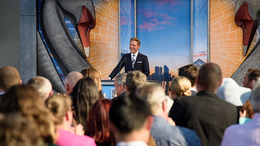 מר דיוויד מיסקביג', מנהיג דת ה-Scientology, נסע 14,500 ק״מ כדי להגיע לפרת׳. הוא סיפר לאורחים בפתיחה החגיגית שבקרוב הוא יחצה 32,000 קילומטרים נוספים כדי לגזור עוד סרט. אבל באשר לפרת', מר מיסקביג' הכריז: ״זה ה-עכשיו שציפיתם לו".