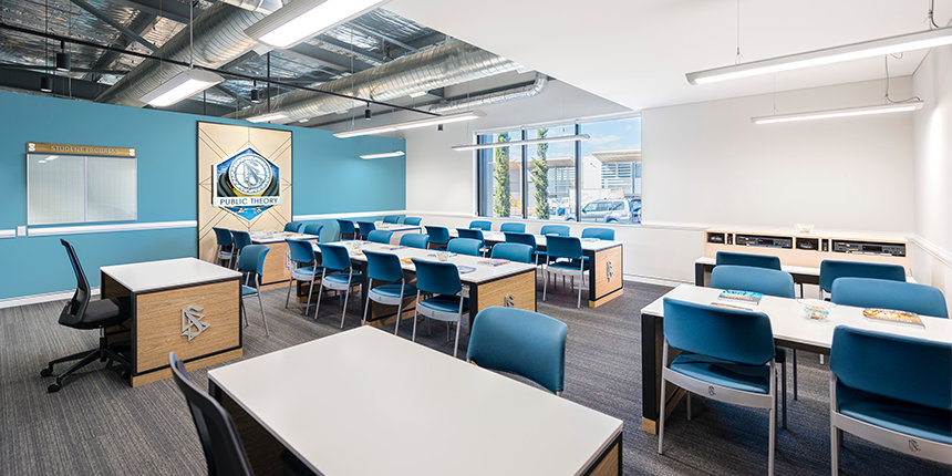 את פני כל המגיעים לארגון ה-Scientology החדש של פרת' מקדמת החזית המרשימה שלו. כאשר חברי הקהילה נכנסים למרחב הפתוח, ניצבת מולם הקבלה עם מראות של מרכז המידע לציבור. המרחב פתוח עם תקרות גבוהות ותאורה בסגנון תעשייתי. קווים נקיים והדגשי מתכת מושחרת עם עץ כפרי גס נותנים תחושה תעשייתית מודרנית בכל רחבי המקום.
