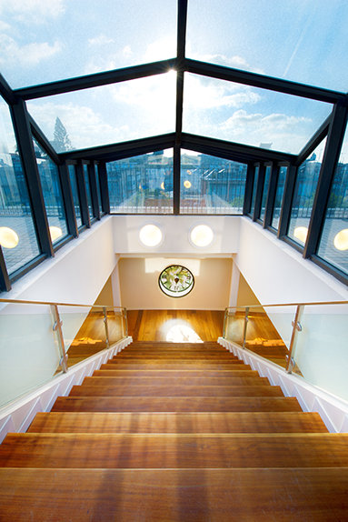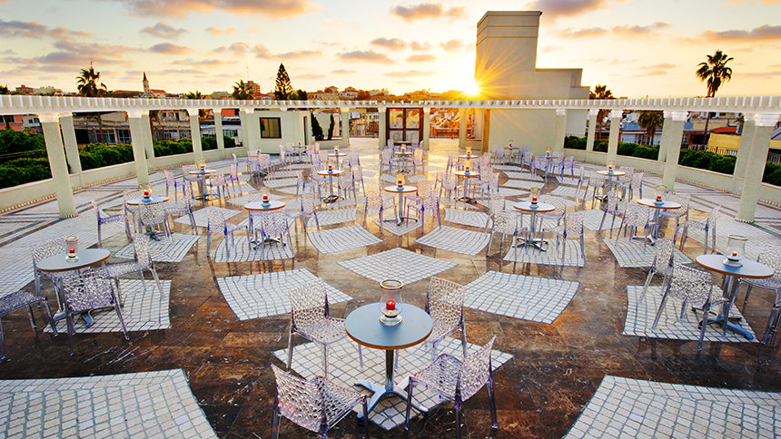 המרכז גם כולל מרפסת ובית-קפה על הגג המוקפים בעמודים אליפטיים, וניתן להעיף מבט משם על יפו ההיסטורית.