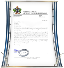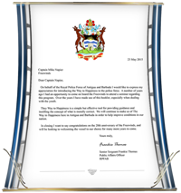 - הוועדה הראשית של המשטרה המלכותית של אנטיגואה כהכרה תודה על 250 קצינים שעברו את תוכנית החינוך של 'הדרך אל האושר' ונשבעו ליישם את הכללים כדי "לרומם את האומה שלהם".