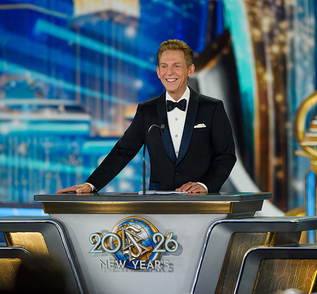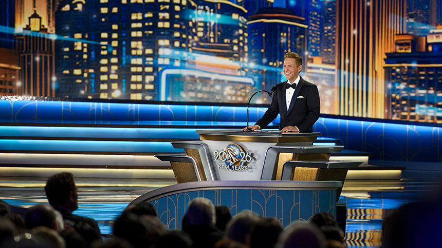 הערב עולה לעוצמה מלאה כאשר מר דיוויד מיסקביג', המנהיג של דת ה‑Scientology, צועד אל הבמה המוארת וחגיגת השנה החדשה 2026 מתעוררת לחיים בשאגה.