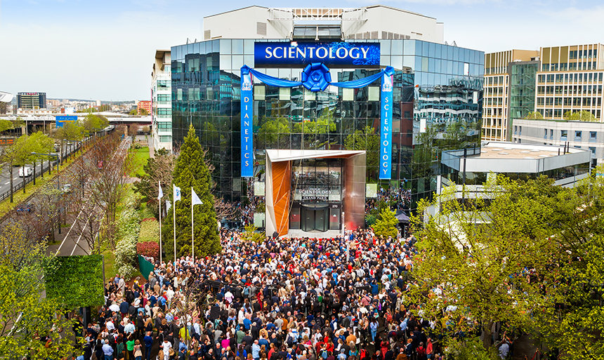 כשאז, אלפי חברי הקהילה הנלהבים והמבקרים הסקרנים נהרו בלהיטות אל הכניסה המפוארת של הארגון. ואז כשהסרט הכחול הענק שעל ראש הבניין הנוצץ גלש למטה, זיקוקים נורו לשמיים, קונפטי סטרימרים מילאו את האוויר, הדלתות נפתחו לרווחה וההמונים חצו את המפתן כדי לסייר בבית הרוחני החדש הזה, ארגון ה-Scientology וסלבריטי סנטר האידיאלי החדש המרהיב של פריז רבתי, שעכשיו בהחלט פתוח.